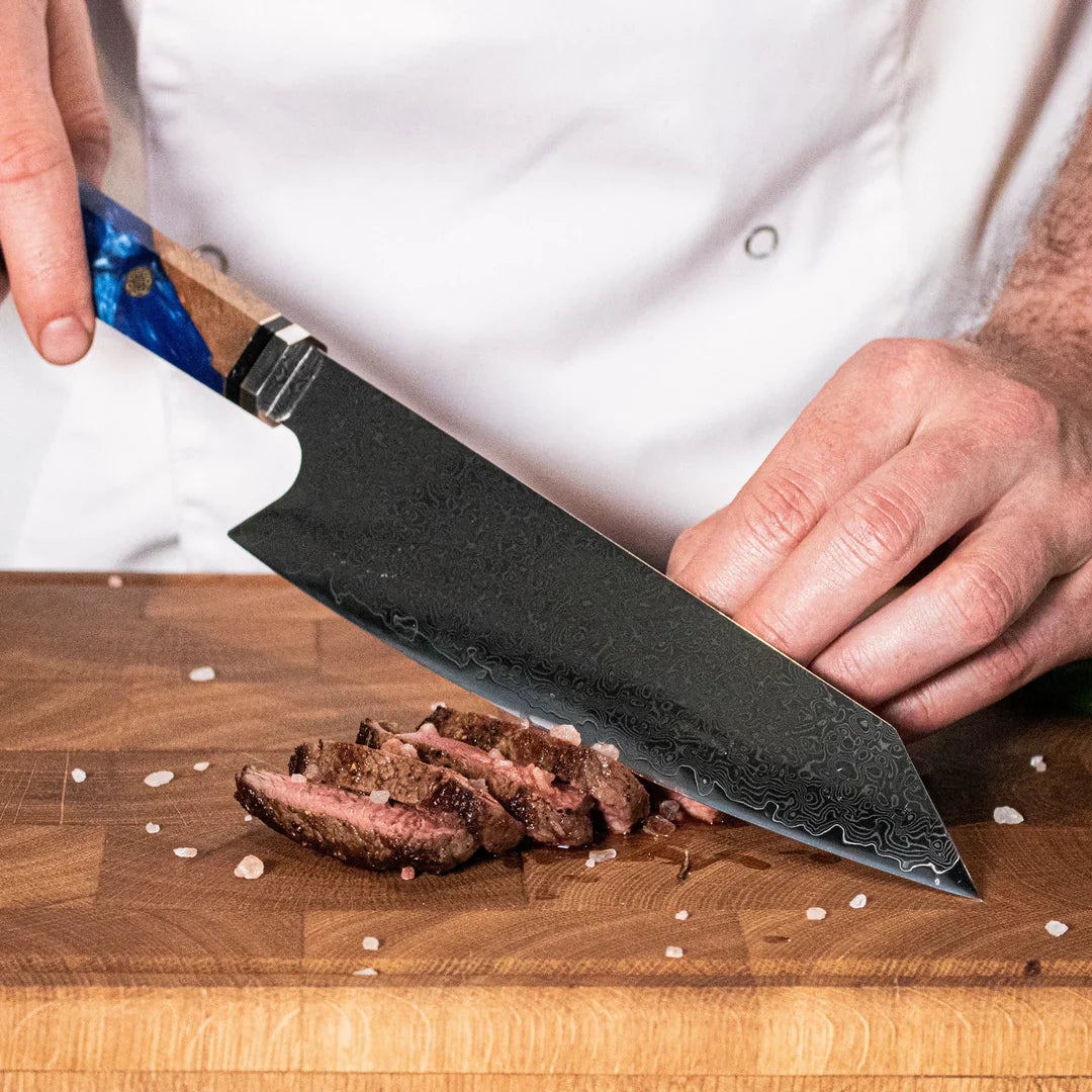 Bladet är uppbyggt av 67 lager av japanskt VG10-stål. som har ishärdats i -196°C, vilket ger dem en otrolig hårdhet på 60+-2 HRC. Knivarna har blivit slipade med en traditionell japansk teknik som kallas Honbazuke som ger knivarna en extraordinär skärpa.